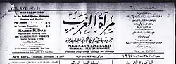 Meraat-ul-Gharb (Arabic: مرآة الغرب, romanized: mirʾāt al-ġarb, lit. 'Mirror of the West') is an Arabic-language newspaper founded and published in New York City by Najeeb Diab in 1899.[1] By 1911, it was considered "the best Arabic newspaper" published in the United States.[2] In 1908, Meraat-ul-Gharb was reported to be "one of the instruments which incited the Turkish military to its recent revolt" against the Ottoman Sultan's Government.[3]