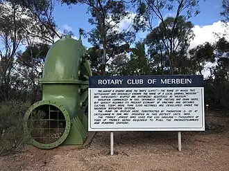 Merbein is the most northern Victorian town and celebrated 100 years as an irrigation settlement in 2009.[2] The Merbein irrigation settlement, originally known as White Cliffs for its river cliffs, was established on a pastoral holding in 1909. It was one of the first state-owned pumped irrigation settlements in Victoria. A Rotary Club of Merbein sign states: "Irrigation commenced in 1910 originally for pasture and grain crops, but quickly assumed its present economy of vineyard and orchard culture."