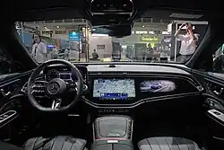 The W214 is the first Mercedes-Benz non-EQ vehicle to utilize the MBUX Superscreen, a tri-screen setup which pairs dual-12.3 in (310 mm) screens with a 17.7 in (450 mm) screen to make what looks like a large screen.[18] The Superscreen features a selfie camera and is able to stream third-party apps such as Angry Birds, TikTok, Vivaldi, and Zoom. Additionally, if the driver looks at the screen, the device will automatically decrease its brightness. Active Ambient Lighting features a range of colours and brightnesses.[19] Because of the 23 mm size increase, kneeroom and legroom are increased by 10 mm (0.39 in) and 17 mm (0.67 in), respectively.[19]