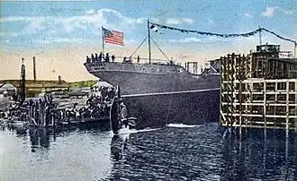 The Merchant Shipbuilding Corporation launched its first ship, a freighter named Sudbury, at the Chester yard on 29 September 1917, and delivered it to the USSB on May 5, 1918. In spite of the company's best efforts however, only four ships of the 68 ordered by the USSB were delivered before the end of hostilities—one freighter and three tankers, all built at the Chester yard. The Chester yard also received a contract from the U.S. Navy for the construction of four minesweepers, but the first of these was also only delivered a few weeks after the war.[11][12]