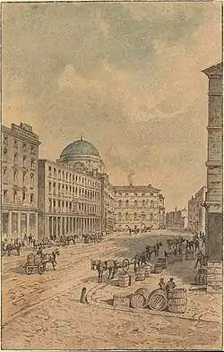 The H-shaped Exchange Building was designed by Benjamin Latrobe and Maximilian Godefroy,[1] and constructed under the supervision of Jacob Small beginning in 1815.[2] The U.S. government paid for the erection of the custom-house wing in 1817.[3] The building opened to the public in 1820.[2]