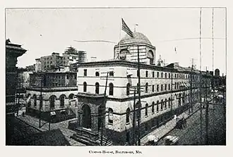 In its day it was "the most important structure in Baltimore," even hosting the offices of Baltimore City Hall for a time.[6] The federal government acquired most (but not all) of the building with purchases in 1853 and 1857.[3] Before the American Civil War there was a hotel on the Gay Street side.[4] In 1884 a newspaper reporter interviewed an old American slave trader named Jack Campbell, and asked if he knew of any surviving remnants of the slave trade in the United States, and Campbell replied, "More than you'd think...Go into any Southern hotel that was built before the war and ask them to let you go down into the cellars. See if you don't find these old cells where the servants of travelers were shut up at night. The Baltimore Custom House was once a hotel, and there are more than two dozen cells under it now."[7]