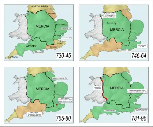 ![]() The Kingdom of Mercia (thick line) and the kingdom's greatest extent during the Mercian Supremacy (green shading) | |||||||||||||