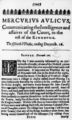 The Mercurius Aulicus newspaper originated during the English Civil War from a suggestion by George Digby, a key advisor to King Charles I, that the Royalist faction needed a method for promoting their views in Parliament-held London.[2] As a result, the publication was established in January 1643 - it is variously termed either a newspaper or a newsbook - the latter being an alternative term for this form of weekly news publication in a quarto format.[3]
