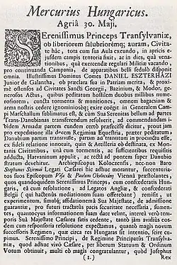 Mercurius Hungaricus (Hungarian: Magyar Merkúr), later Mercurius Veridicus ex Hungaria was the first periodical newspaper in the Kingdom of Hungary,[1] published between 1705 and 1710 (only seven issues). It was a semiofficial news release for the Rákóczi's War of Independence, the articles were written in mostly Latin language.