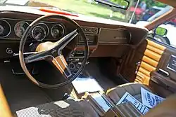 The $185 upgrade to the XR-7 brought further European influence, including a (simulated) wood-trim dashboard, full instrumentation (black-face gauges), toggle switches, and an overhead console; if so equipped, the automatic transmission was fitted with a T-handle console shifter.[2] The Cougar was offered with nearly every Mercury option (including speed control), with the sole exception of power windows. A "Tilt-Away" steering wheel was also offered, being a power-operated steering column that swung up and out of the way when the driver's door was opened, the transmission in "park", and the ignition was off.[14]