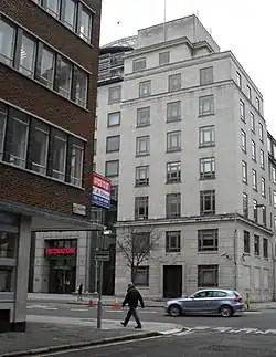 The architect was Gordon Jeeves. The interiors were designed by H C Upton, Cable & Wireless's own architect. The three glass panels in the entrance were the work of John Hutton.