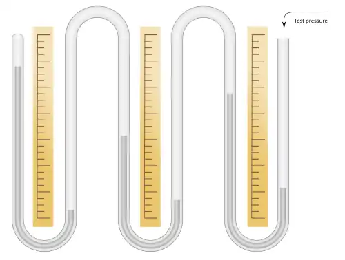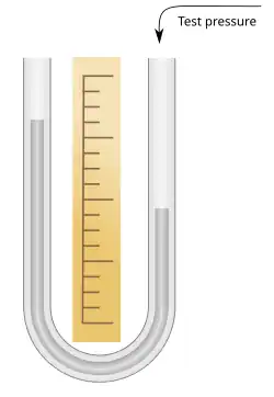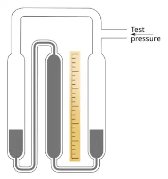 The instrument consists of a glass U-tube half-filled with mercury. One end is connected to the vessel whose pressure is being measured. The other may be either left open or sealed. If it is left open, the pressure measured is relative to air pressure, which is variable. If it is sealed, the pressure measured is the absolute pressure. The tube is sealed during manufacture with the sealed end containing a vacuum.[1] Mercury is a useful material to use in a manometer because of its high density. This means that a much shorter column is needed compared to water.[2] For instance, the pressure represented by a column of 100 mm of water is just under 7.4 mm of mercury (mmHg).[3]