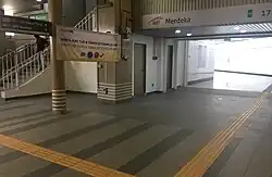 The Merdeka MRT station is a mass rapid transit (MRT) underground station in Kuala Lumpur, Malaysia. It is one of the stations of the Klang Valley Mass Rapid Transit (KVMRT) MRT Kajang Line, formerly known as Sungai Buloh–Kajang Line and serves as an interchange station with Plaza Rakyat LRT station for LRT Ampang and Sri Petaling lines. The station was opened on 17 July 2017 under Phase Two operations of the MRT line.[1]
