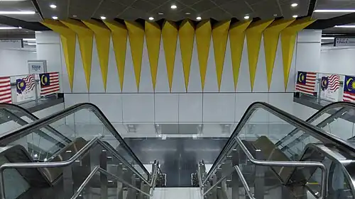 The theme is manifested through several features such as a wall at the Upper Concourse Level bearing a relief of the Rukun Negara, the Malaysian national pledge. The ceiling above the escalator leading down from the Upper Concourse Level to the Lower Concourse Level bears a motif of the arms of the 14-pointed star on the flag of Malaysia.[2][3]