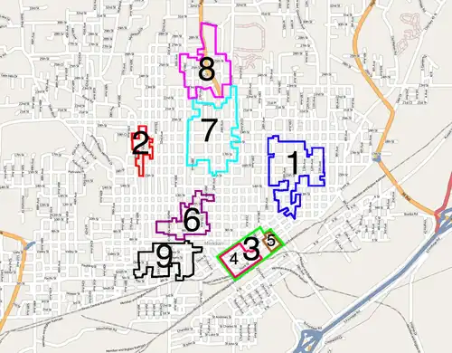 3 Meridian Downtown Historic District – runs from the former Gulf, Mobile and Ohio Railroad north to 6th St between 18th and 26th Ave, excluding Ragsdale Survey Block 71.