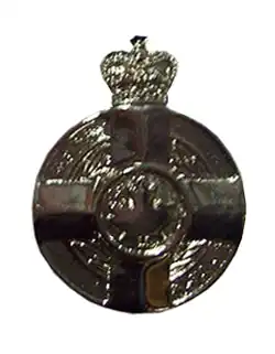 The Meritorious Service Medal, for both divisions, is in the form of a circular, silver disc with, on the obverse, a raised Greek cross, the ends splayed and rounded, a laurel wreath visible between them, and St. Edward's Crown, as a symbol of the Canadian monarch's role as the fount of honour,[3] capping the top arm beyond the circumference of the medal. At the cross's centre is a roundel bearing a maple leaf, and on the reverse are two concentric circles, the inner one containing an etched royal cypher of the reigning monarch and Commander-in-Chief of the Canadian Forces, and the outer one engraved with the words "meritorious service méritoire".[1]