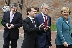 The Merkel-Raute[1] (German for "Merkel rhombus"), termed the Merkel diamond[2], Triangle of Power, or simply, Merkel Hands, by English-speaking media,[3] is a hand gesture made by resting one's hands in front of the stomach so that the fingertips meet, with the thumbs and index fingers forming a rough quadrangular shape. This signature gesture of Angela Merkel, former Chancellor of Germany, has been described as "probably one of the most recognisable hand gestures in the world".[2]