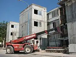 In places where a standard shelter could not be constructed, a common alternative is a cement construct called Migunit (מיגונית), lit. small shelter. It is intended to protect from bombs but not from earthquakes. The standard migunit has a rectangular body with an extra extended entrance.[5]