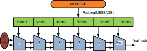 The popularity of this construction is due to the fact, proven by Merkle and Damgård, that if the one-way compression function f is collision resistant, then so is the hash function constructed using it. Unfortunately, this construction also has several undesirable properties: