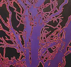 In 2010, Temkin shifted subject matter from fingerprints to trees, still retaining her labor-intensive working process. Recalling both her fence installations and her re-assembled fingerprints, she describes her process as perceiving "negative space on canvas in three dimensions… By carving away this space with paint, the tree is revealed, a process of working from the outside to depict the inside."[33] In these in-depth explorations of color, Temkin allows under-layers to show through, creating depth, vitality and a visual record of its own development. The series, evolving through Temkin's rigorous exploration, has moved in varying degrees toward and away from abstraction, producing often surprising results that range from "striking cactus-like silhouettes, painted in desert-twilight tones"[34] to graphic forms resembling thermographic maps, visual afterimages, and reversed video stills.