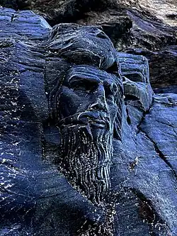 ![]() The 'Sleeping Merlin' sculpture carved into the cliff face near the cave entrance | |