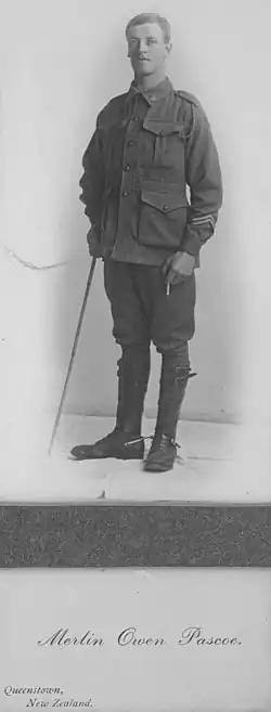 - ^ a b c "Roll of Honour. Killed in Action. Quarter-master Merlin Owen Pascoe". Lake Wakatip Mail. No. 3302. 27 August 1918. Retrieved 14 August 2016.