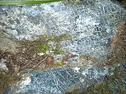In foliated serpentinites newly formed chlorite is more common. Chlorite grows in leaf-like layers paralleling the regional foliation. This process can even lead to chlorite schists observable at La Rougerie, Cussac, Lageyrat, La Boissonie and Champagnac-la-Rivière. These chlorite schists are cross-cut in places by asbestos veins and coated by chalcedony or quartz.