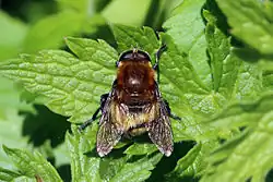 Merodon equestris (Narcissus bulb fly, greater bulb fly, large bulb fly, large Narcissus fly)[2] is a Holarctic species of hoverfly (Family Syrphidae).[3][4][5] [6][7][8] Like many other hoverflies it displays a colouration pattern similar to a stinging insect (a bumblebee in this case) as an evolutionary defense mechanism. Other syrphid bee mimics are Mallota, Arctophila, Criorhina, Pocota and Brachypalpus. Merodon species are distinguished from these by the very strong hind femora, which bear a large triangular projection on the underside near the tip. It flies in low vegetation while the other bumblebee mimics prefer higher vegetation layers.