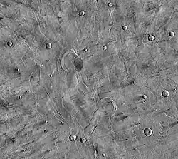 Syrtis Major was the object of much observation due to its seasonal and long-term variations. This led to theories that it was a shallow sea and later that its variability was due to seasonal vegetation. In the 1960s and 1970s, the Mariner and Viking planetary probes led scientists to conclude that the variations were caused by wind blowing dust and sand across the area. It has many windblown deposits that include light-colored halos or plumose streaks that form downwind of craters. These streaks are accumulations of dust resulting from disruption of the wind by the elevated rims of the craters ('wind shadows').[1]