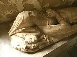 Sir John III Wadham, eldest son and heir of William Wadham (d. 1452) of Edge, Branscombe in Devon, Sheriff of Devon in 1442, by his wife Margaret Chiselden, a daughter and co-heiress of John Chiselden of Holcombe Rogus in Devon. He married Elizabeth Popham, a daughter and co-heiress of Sir Stephen Popham (c. 1386 – 1444). From this marriage the Wadhams inherited land in Braydon, near Merryfield, which they made their principal seat.[17] It is believed by Rogers (1888) that the small but finely sculpted surviving alabaster effigy of a lady in Ilton Church represents Elizabeth Popham, heiress of Merryfield.[18]