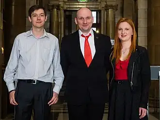 Skeptics with a K, "the podcast for science, reason and critical thinking", is the official podcast of the Society.[26] Its first episode was recorded on 28 July 2009, at Mike Hall's home. The podcast features hosts Mike Hall, Michael "Marsh" Marshall and Colin Harris – in April 2014 replaced by Alice Howarth – discussing recent events from a skeptical point of view. Co-host Michael Marshall described it as, "a fairly-shambolic, overly-enthusiastic and snarky mix of science, skepticism and sarcasm."[27] A popular semi-regular segment, until 14 July 2011 when it concluded with a special "Best of" edition, was a fact check on the children's book The Giant Book of Fantastic Facts.[28] On 1 April 2013, an entire episode consisted of fictional stories including a parody of Ghost Busters, a story about the "Mersey Book of Monsters" and one about the "Paranormal Investigation Society Scotland (PISS)".[29] The hosts have appeared as guests on other popular podcasts including Cognitive Dissonance and the Token Skeptic.[30]