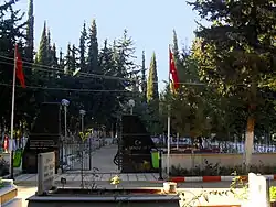 The rectangular cemetery is located in the Yusuf Kılıç neighborhood, one of the northernmost neighborhoods of Mersin. The bird's flight distance to the Mediterranean coast (hence the city center) is 3.6 kilometres (2.2 mi). Administratively, the cemetery is part of the Toroslar Municipality.[1] Akbelen Boulevard, which connects the city center to the Toros Mountains, is to the west and Okan Merzeci Boulevard, which is a ring road of Mersin, is to the south of the cemetery.[3] The main gate is on the south wall. The total area of the cemetery is about 360 decares (360,000 m2), including a "soldiers-memorial cemetery" (Turkish: şehitlik).