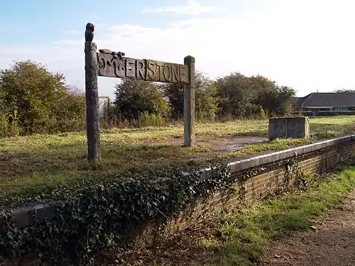 It opened in 1875 and closed 81 years later.[4] In 1897 a new line opened[5] from Merstone to provide an alternative route to the south-east corner of the island, running initially to St Lawrence and in 1900 to Ventnor West station . Located in the heart of a farming community, Merstone was snowed under during the harsh winter of 1947.[6] The station building was demolished after closure,[7] although the platform is still existent. Merstone station is now an access point onto National Cycle Route 23