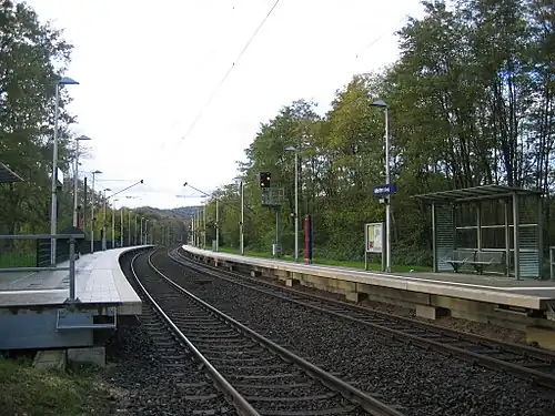 Merten station is a station on the Sieg Railway, situated in Eitorf, Rhein-Sieg-Kreis in the German state of North Rhine-Westphalia. The station was opened between 1897 and 1905 on a section of the Sieg Railway, opened by the Cologne-Minden Railway Company (German: Cöln-Mindener Eisenbahn-Gesellschaft, CME) between Hennef (Sieg) and Eitorf on 1 August 1860.[5] It has two platform tracks and is classified by Deutsche Bahn as a category 6 station.[1]