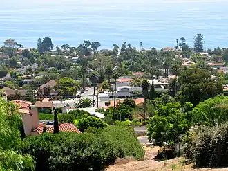 The field occupied a small area on a mesa to the west of the Santa Barbara Harbor, within the limits of the City of Santa Barbara, now the location of the neighborhood known as "The Mesa". The mesa from which the neighborhood takes its name is about two miles (3.2 km) long from west to east and about 3,000 feet (910 m) across from north to south. The northern boundary is Lavigia Hill, which rises north of Cliff Drive; some of the oil wells were drilled on the southern slopes. The southern boundary of the mesa is the abrupt drop-off at the cliff overlooking the ocean. The cliffs rise 120 feet (37 m) above the beach at the western end of the mesa, gradually diminishing in height to only 40 feet (12 m) at the eastern end, near Santa Barbara City College.[3] Prior to the oil field being developed, the flat top of the mesa was farmland, with one imposing former residence, the abandoned and earthquake-damaged "Dibblee Castle" built at the eastern end, overlooking Santa Barbara harbor.[4][5]