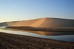 The eastern section is situated over a low, rocky promontory which is enclosed by sabkhas on the coast. The sabkha region is 40 kilometres (25 mi) long and between 7 kilometres (4.3 mi) and 10 kilometres (6.2 mi) wide. The southern portion of Mesaieed is characterized by sand dunes.[12] These dunes are in a state of constant migration, propelled by the dominant north-northwestern wind known locally as shamal.[23] To the northeast of the coast, where the residential section is located, there are sandy hillocks which lie 9 m above sea level.[24] Roughly 262 hectares of mangroves are found around Mesaieed's coastline.[25]