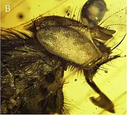 - ^ a b c d e f g h Cerretti, P; Stireman, JO III; Pape, T; O’Hara, JE; Marinho, MAT; Rognes, K; Grimaldi, DA (2017). "First fossil of an oestroid fly (Diptera: Calyptratae: Oestroidea) and the dating of oestroid divergences". PLOS ONE. 12 (8 (e0182101)): e0182101. Bibcode:2017PLoSO..1282101C. doi:10.1371/journal.pone.0182101. PMC 5568141. PMID 28832610.
