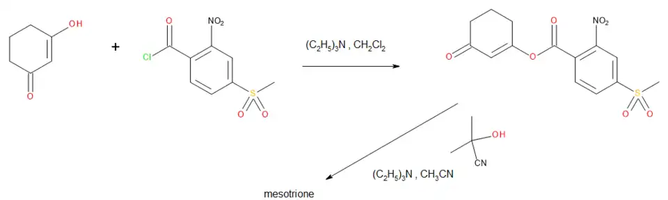 The synthesis of mesotrione[13] was first disclosed in patents[14] filed by ICI, who had acquired Stauffer in 1987.[15] 1,3-Cyclohexanedione is first reacted with the acid chloride of 4-(methylsulfonyl)-2-nitrobenzoic acid under conditions in which the enolic hydroxyl group of the diketone reacts to form the benzoylated derivative. In a separate step, this is rearranged to mesotrione using a catalytic amount of cyanide ion derived from acetone cyanohydrin.