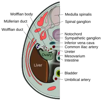 ![]() Transverse section of human embryo eight and a half to nine weeks old. (Mesovarium visible at center.) | |