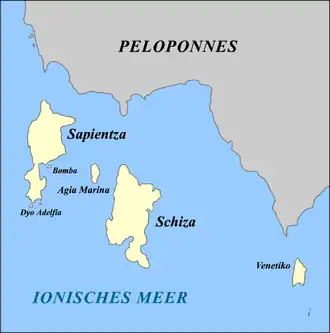 Messenian Oinousses (Greek: Μεσσηνιακές Οινούσσες, romanized: Messiniakés Inoússes) is a Greek island complex in the southwest coasts of Peloponnese, in Ionian Sea. It is located to the south of Messenian peninsula, opposite Methoni and Foinikounda. The archipelago comprises the islands Schiza and Sapientza and the islets and rocks Venetiko, Agia Mariani, Avgo, Dyo Aderfia and Boba.[1] The largest island is Schiza, whereas the only populated island is Sapientza. To the southwest of Oinousses is the deepest point of the Mediterranean Sea, the Calypso Deep, also known as the Oinousses Deep or the Vavilov Deep.[1][2] Oinousses has been included in the environmental program Natura 2000. The islands belong to Pylos-Nestor municipality.