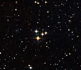 Messier 73 (M73, also known as NGC 6994) is an asterism of four stars in the constellation Aquarius which was long thought to be a small open cluster. It lies several arcminutes east of globular cluster M72. According to Gaia EDR3, the stars are 1030±9, 1249±10, 2170±22, and 2290±24 light-years from the Sun, with the second being a binary star.[4]