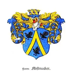 The name can be traced back to Ivan Ivanovich Mestmaker (German Johann von Mestmacher; 1732–1805),[1] who was the resident minister under the Prince-bishop of Lübeck, later envoy to Dresden. He was elevated to baronial level in 1777.