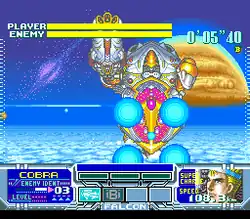 The player attacks enemies using rapid fire by holding down the fire button, energy bolts, bombs, and an array of special items.[2][3][6] The ST Falcon charges energy bolts up to three times when the player is not firing and fires a treble shot once the power meters are filled.[3][4] The player counters enemy fire by intercepting their projectiles, though some enemy attacks can only be deflected by shooting energy bolts.[4][5] Each enemy ST has destructible weak points that the player must shoot to deal damage.[3][4][9] Completing the single-player mode unlocks the ST Tornado, piloted by Carol Eugene.[3][4][7] The ST Tornado can store up to ten energy beams and fire each one individually but has less defense compared to the ST Falcon.[3]
