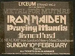 The Metal for Muthas Tour was a 1980 concert tour headlined variously by Motörhead, Samson, and Saxon. Supporting the new wave of British heavy metal compilation album Metal for Muthas, the tour featured a large number of bands identified as the founders of the movement. During the tour, the three headlining bands were supported by twenty-two other bands, including a then-unknown Iron Maiden, who performed on the first 11 dates of the tour.[1]