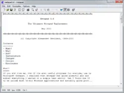 Metapad is an open-source text editor for Microsoft Windows 9x/NT/XP/Vista/7, developed by Alexander Davidson since 1999.[3][4][5][6] The aim of Metapad is to provide a near drop-in replacement of Notepad in Windows. Metapad was distributed as freeware for the first ten years of its existence. On March 20, 2009, the 10th anniversary of its initial release, the Metapad source code was released under GPL-3.0-or-later.[7]