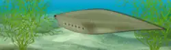 Whilst named after the Ediacaran organism Spriggina, later work has shown the two to be unrelated.[4] Metaspriggina is considered to represent a primitive chordate, possibly transitional between cephalochordates and the earliest vertebrates, albeit this has been questioned because it seems to possess most of the characteristics attributed to craniates. It lacked fins and had a weakly developed cranium, but it did possess two well-developed, upward-facing eyes with nostrils behind them.