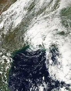 Upon moving ashore, the National Hurricane Center expected the forward path of Ivan to be blocked, and accordingly forecast the hurricane to stall in the southern Appalachian Mountains before dissipating.[25] As the hurricane crossed Mobile Bay it turned to the north-northeast, and within twelve hours Ivan rapidly weakened to tropical storm status.[1] The circulation became less-defined,[26] and early on September 17, the cyclone deteriorated into a tropical depression over northeastern Alabama. Ivan accelerated to the northeast ahead of an approaching cold front, dropping heavy rainfall along its path and also producing a widespread tornado outbreak from Alabama through Maryland. Late on September 18, the remnants of Ivan transitioned into an extratropical low as it merged with the cold front over the Delmarva Peninsula.[1]