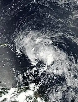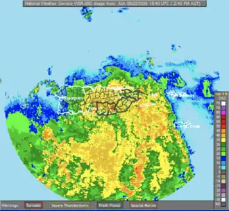 Initial aircraft reconnaissance into the system late on August 20 into August 21 revealed a poorly organized system with an ill-defined, elongated surface low.[8] Furthermore, the system's mid-level circulation was displaced several hundred miles southeast of the assumed surface circulation. During the early part of August 21, the depression may have degenerated into a tropical wave, although the NHC continued to issue advisories on the system.[9] The depression continued to struggle because of significant mid-level wind shear, dry air, and its fast forward motion of over 20 mph (32 km/h).[10] However, a Hurricane Hunters flight on August 21 observed gale-force winds and a center farther south then previously estimated. Consequently, the National Hurricane Center upgraded the depression to a tropical storm and named it Laura at 13:05 UTC; post-storm analysis determined that the system had become a tropical storm around 12:00 UTC.[11][1] This made Laura the earliest twelfth named Atlantic storm ever recorded, beating the record of Hurricane Luis of 1995 by eight days. At the time, Laura was located around 230 miles (370 km) east-southeast of the northern Leeward Islands and had maximum sustained winds of 45 mph (72 km/h) and a minimum central pressure of 1,007 mbar (29.7 inHg). Despite being stronger, Laura remained poorly organized due to moderate wind shear as it moved over the Leeward Islands, with most of its convection and strongest winds located north and east of the center of circulation.[12] Continuing west-northwestward with no change in strength, Laura made its first landfall in Antigua around 20:30 UTC before making landfall in Nevis around 23:30 UTC.[1] Eventually, Laura became slightly better organized and it strengthened a little as it passed south of Puerto Rico, although its center remained elongated.[13][14] During the afternoon of August 22, a strong mesocyclone within the storm's broader circulation impacted Puerto Rico; sustained winds associated with this feature reached 60 mph (97 km/h) in Las Marías, although this was not representative of the storm's actual intensity.[15] Laura then made landfall near San Pedro de Macorís, Dominican Republic at around 04:30 UTC on August 23 with 1-minute sustained winds of 50 mph (80 km/h) and a pressure of 1004 mbars (29.64 inHg).[1]