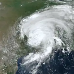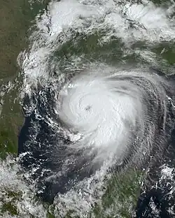 Laura's rapid intensification then ended and its intensity more or less leveled off as it approached southwestern Louisiana.[1] Laura also began to experience some shear from the low to its west, which restricted its outflow on its west side and its pressure began to fluctuate.[30] However, Laura continued to have a very impressive appearance on satellite imagery with a well-defined eye and circular rain bands.[31] Turning almost due north, Laura made its final landfall near Cameron, Louisiana around 06:00 UTC with 150 mph (240 km/h) winds and a pressure of 939 mbars (27.73 inches).[32] The wind speed made Laura the first Category 4 hurricane to ever hit southwestern Louisiana since the 1856 Last Island hurricane as well as the strongest hurricane to hit the state since Hurricane Camille in 1969 (which produced Category 5 conditions over the southeastern portion of the state).[1][33] Forecasters at the NHC described the system as "a ferocious looking hurricane with a clear circular eye, an intense eyewall, and tightly-coiled surrounding spiral bands."[34]