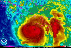 Based on a peak SFMR measurement of 165 mph (266 km/h), the NHC estimated peak winds of 165 mph (265 km/h) with a central pressure of 942 mbar (hPa; 942 mbar (27.82 inHg).[1] At its peak intensity, the storm was centered less than 90 mi (150 km) north of Punta Gallinas, Colombia, at 13.4 degrees north.[1] This made Matthew the southernmost Category 5 hurricane on record in the Atlantic basin, surpassing Hurricane Ivan.[1][22] Around the time of peak intensity, nighttime visible imagery from the Suomi NPP satellite revealed gravity waves over the hurricane.[23] Matthew featured unusually abundant lightning in its eyewall.[1] Additionally, a rare phenomenon known as lightning sprites were observed above the storm as far away as Puerto Rico.[24] The roles of all three occurrences, if any, in the intensification of Matthew—and tropical cyclones in general—is presently unknown.[1][23]