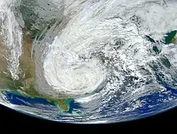 NOAA meteorologist Martin Hoerling attributed the "immediate cause" of Sandy to "little more than the coincidental alignment of a tropical storm with an extratropical storm."[63] Trenberth agrees that the storm was caused by "natural variability", but adds that it was "enhanced by global warming".[59] One factor contributing to the storm's strength was additional energy from abnormally warm water off the North American East Coast, where global warming was identified as contributing 1.1 °F (0.6 °C) of the 5.4 °F (3 °C) above-average sea surface temperatures.[59] As the temperature of the atmosphere increases, the capacity to hold water increases, leading to stronger storms and higher rainfall amounts.[69]