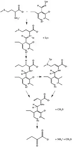 MGL also catalyzes α, β-elimination L-cysteine, degradation of O-substituted serine or homoserine, β- or γ-replacement, as well as deamination and γ-addition of L-vinylglycine. The reaction mechanism initially consists of the amino group of the substrate connected by a Schiff-base linkage to PLP. When a lysine residue replaces the amino group, an external aldimine is formed and hydrogens from the substrate are shifted to PLP. A neighboring tyrosine amino acid acts as an acid catalyst and attacks the substrate, consequently eliminating the thiol group from the substrate. Lastly, α-keto acid and ammonia are released from PLP.[2]