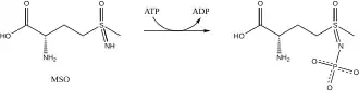 MSO is phosphorylated by glutamine synthetase. The resulting product acts as a transition state analog that is unable to diffuse from the active site, thereby inhibiting the enzyme.[5]