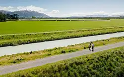 The Rangitata Diversion Race or RDR is a combined irrigation and power generation scheme that diverts water from the Rangitata River to irrigate over 100,000 hectares of farmland in mid-Canterbury. The main canal is 67 km long, and passes immediately to the west and north of Methven township. The RDR project was the first major river diversion in New Zealand, and the largest irrigation scheme in the country. Construction began in 1937, paused for World War 2 and was completed in 1945.[66][67]